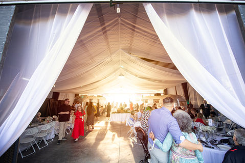 A steel structure featuring an asymmetrial roofline and sliding barn doors we fabricated and installed ourselves. they will protect you from the elements. We configure the tables and chairs to seat 150 comfortably around 60 inch round tables, yet still leaving room for additional tables, displays, and other design elements. As you'll see in the pictures below, we kept this space as a blank canvas for you to design with your own flavor and vibe.